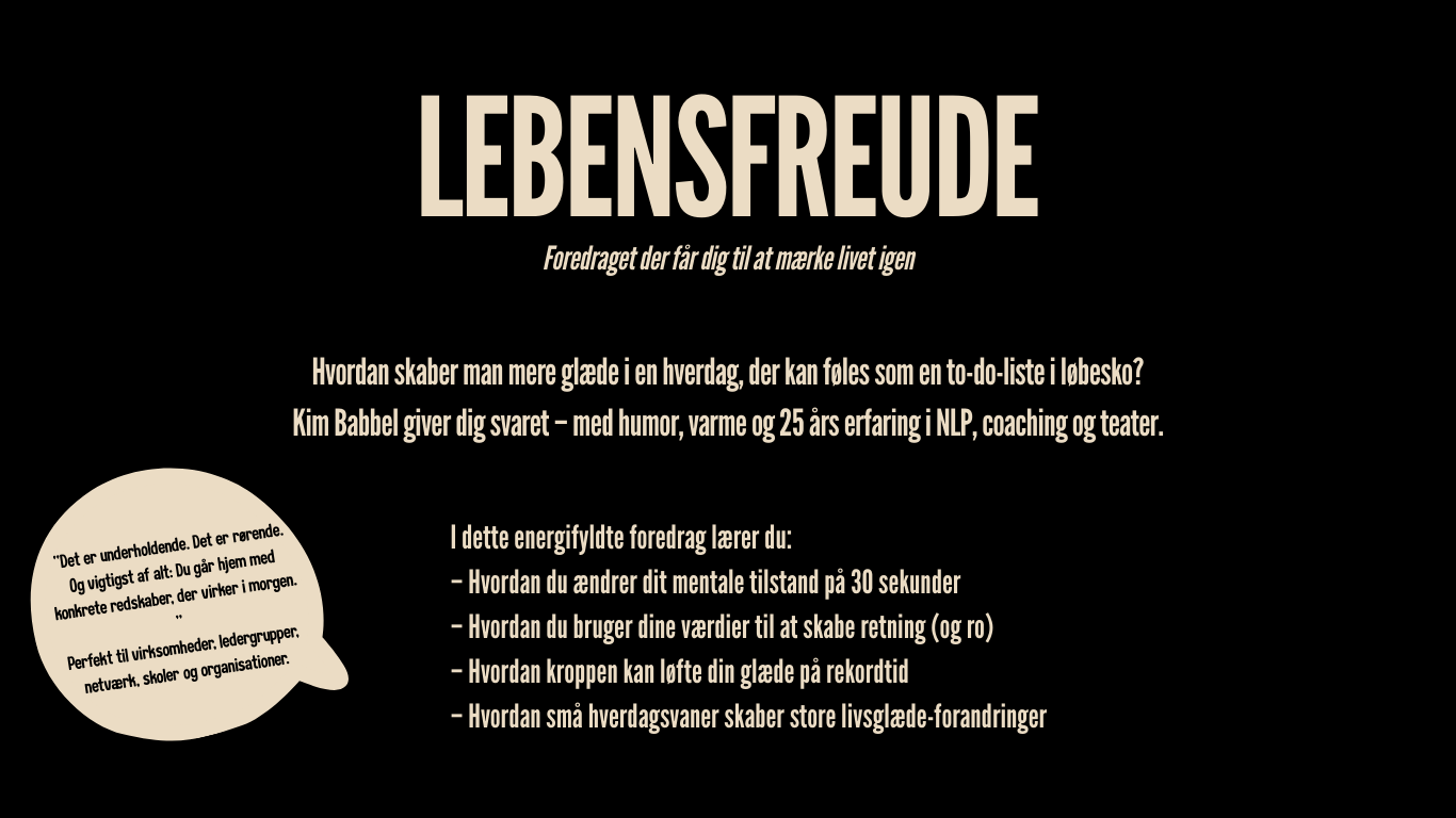 “Kim Babbel has been my “teacher” in Communication, Mindfulness and NLP etc. He is a VERY inspiring person with a huge knowhow within every aspect of Therapy, Psychology, NLP, Communication, Mindfulness, Meditation and Coaching. Kim is also a great colleague, with a very creative and non-conservative mindset. It’s always difficult to write a good recommendation which “stands out from the crowd”, so I will just state: When Kim enters a room full of people, no matter how big it is, the atmosphere and the people’s mood will naturally change to the better. And when he works with smaller groups he is even better.”